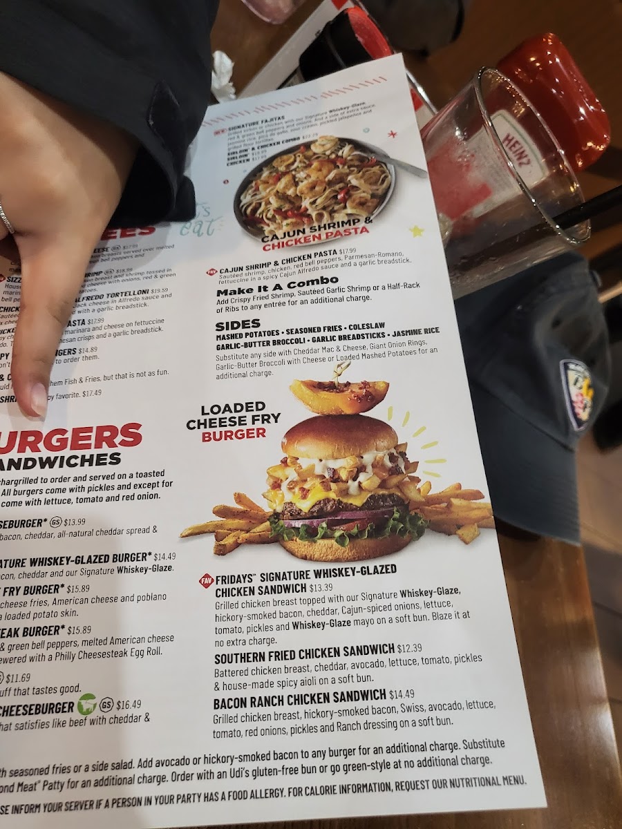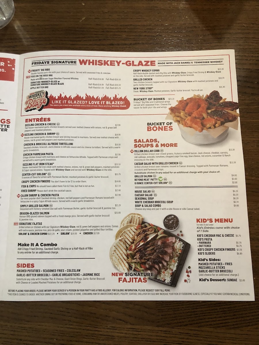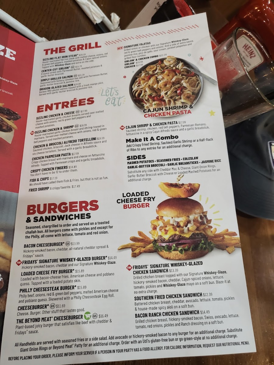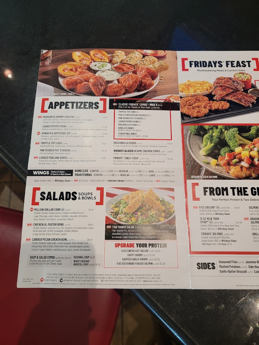 - Fridays Grill: Savor our newly launched grilled entrees, including two succulent 5 oz grilled chicken breasts or a 6 oz sustainably raised salmon filet, perfectly complemented with garlic butter and seasonal veggies.