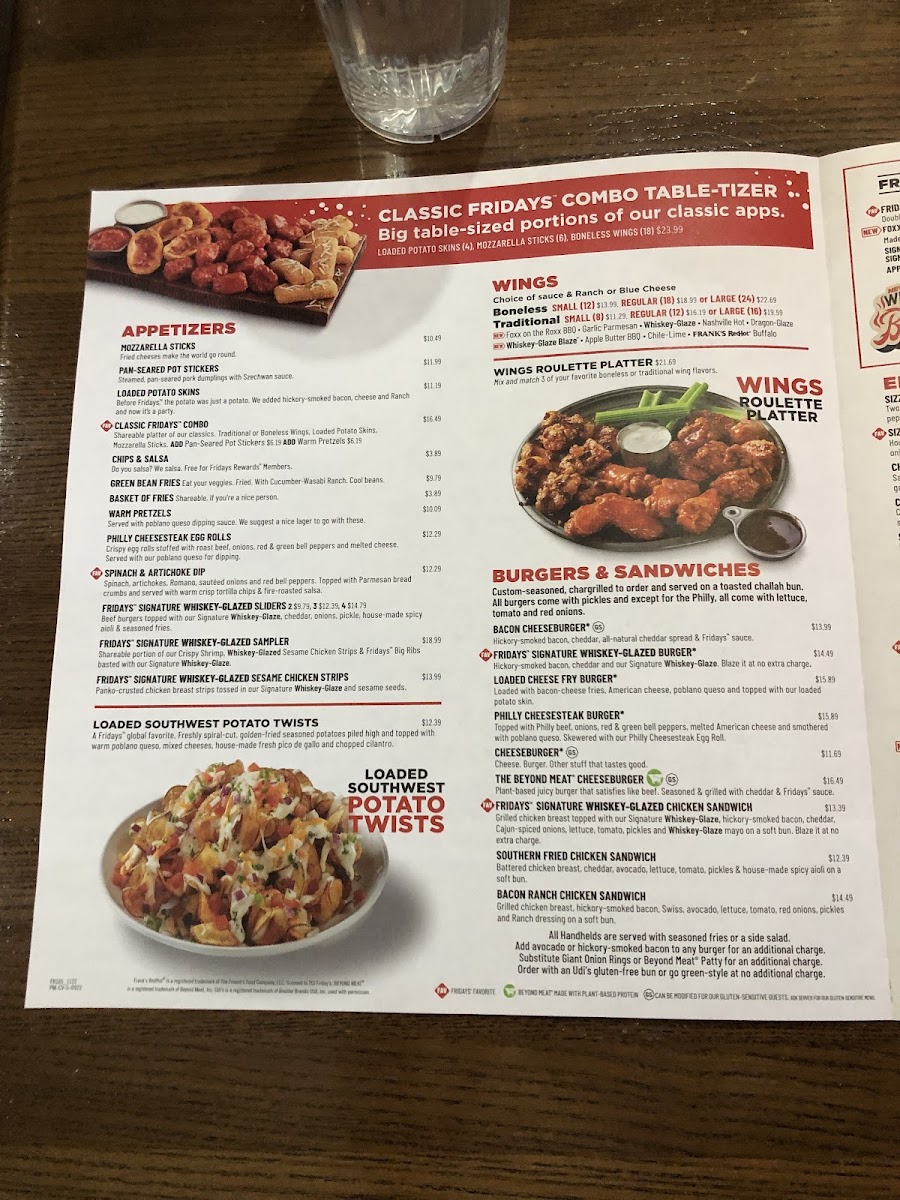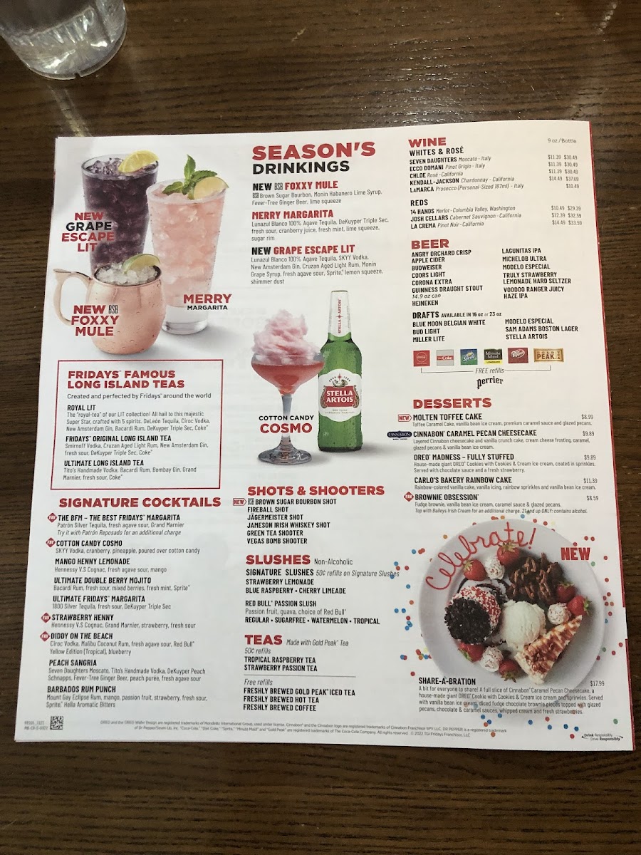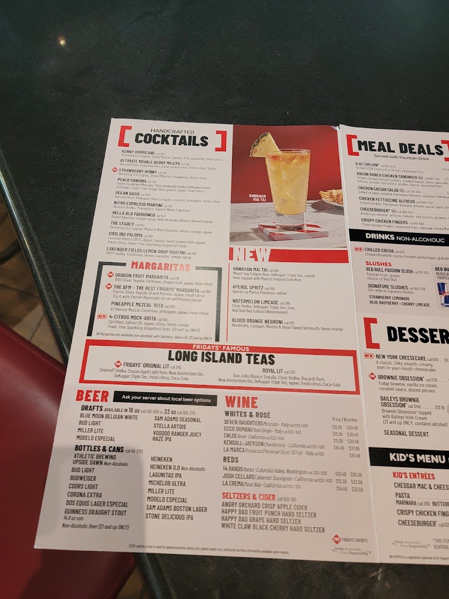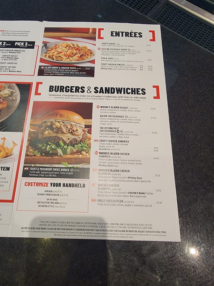- Fridays Grill: Savor our newly launched grilled entrees, including two succulent 5 oz grilled chicken breasts or a 6 oz sustainably raised salmon filet, perfectly complemented with garlic butter and seasonal veggies.