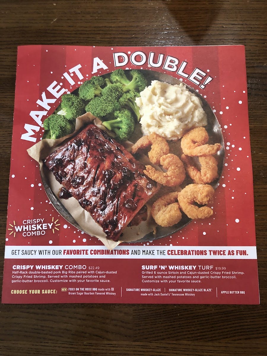 Double-basted pork Big Ribs, Apple Butter BBQ or Whiskey-Glaze, seasoned fries, coleslaw